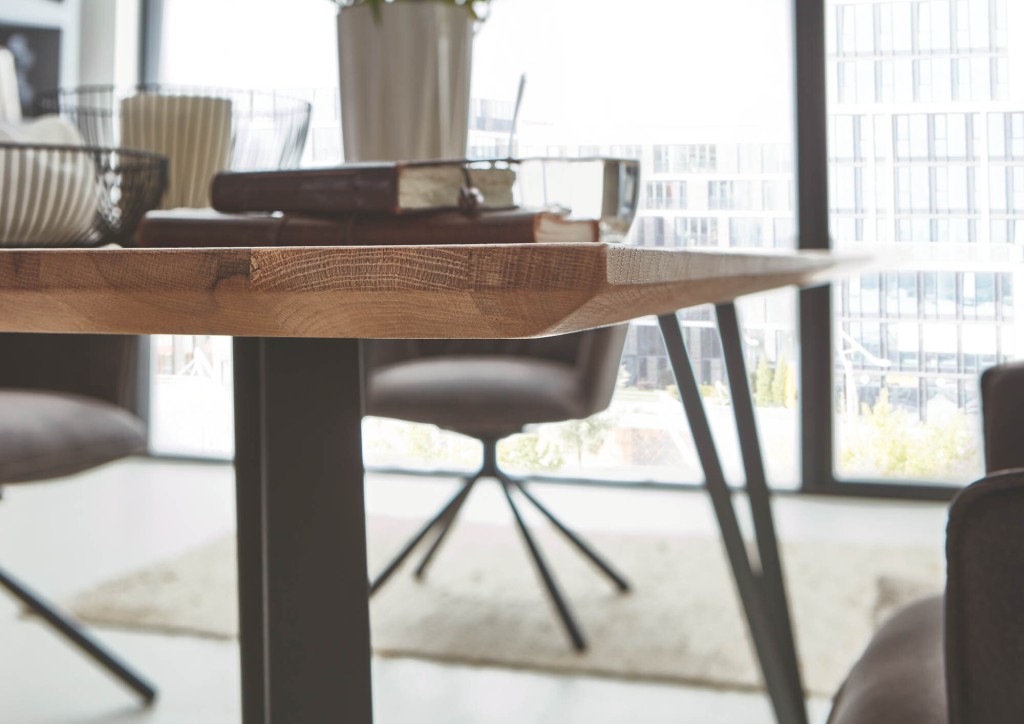 Tischplatte Balkeneiche massiv natur, strukturgehobelt mit Gebrauchsspuren, Plattenprofil FACETTE, Gestell Eisen schwarz, LBH ca. 160/90/77 cm
