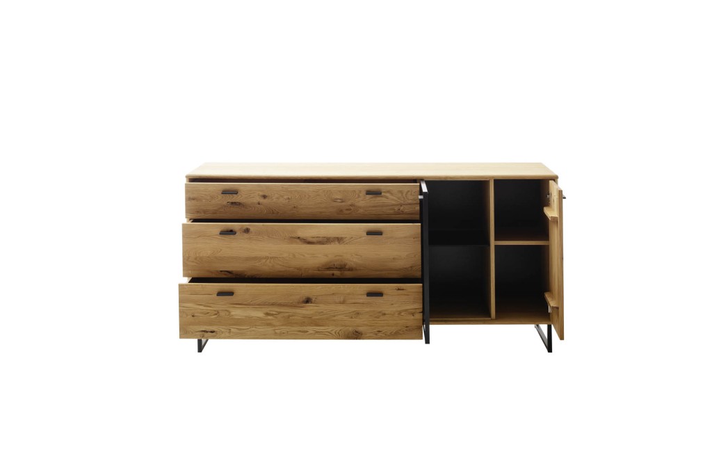 Front Wildeiche massiv geölt, durchgehende Lamelle, Alurahmentür anthrazitfarbig, Korpus Wildeiche geölt furniert, Rückwand sichtbar anthrazit Nachbildung, Füße und Griff Metall anthrazit, 2-türig, 1 Glastür, 3 Schubkästen, BHT ca. 180/86/44 cm