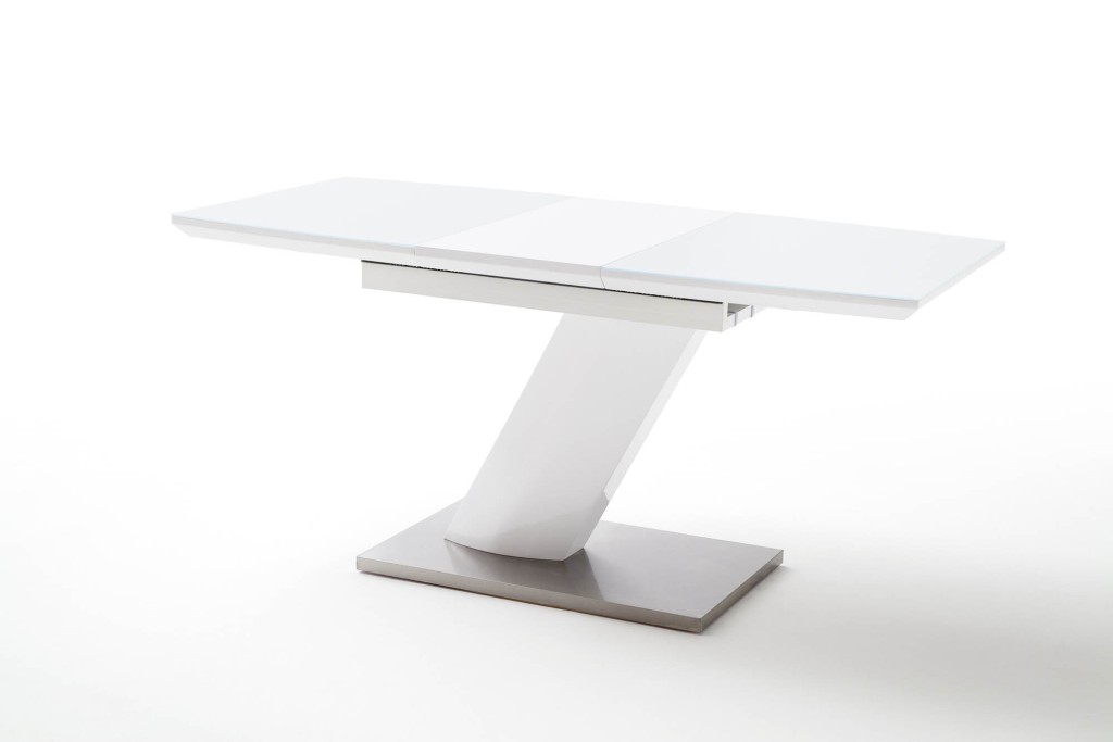 Platte MDF Hochglanz weiß lackiert, Sicherheitsgleis, Säule MDF Hochglanz weiss lackiert, Bodenplatte Edelstahl gebürstet ummantelt, Synchronauszug, Einlegeplatte, Bootsform, LBH ca. 140(180)/80/76 cm
