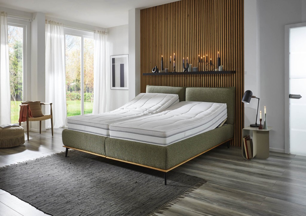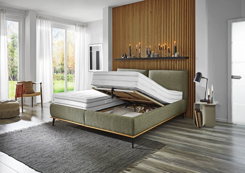 Flachgewebe, Nutzschicht 100 % recyceltes Polypropylen, Farbe lind, Kopfteil Rücken unecht, Metallfüße schwarz, Buchenschichtholz Lattenrahmen, Kopfteil 4-fach manuell verstellbar, Fußteil aufklappbar, Bettkasten leicht konisch mit Sichtholzrahmen in Wildeiche, Gasdruckfeder zum Öffnen, Matratzen Taschenfederkern H2/H3, Drellbezug geteilt, Liegefläche ca. 180x200 cm, BHT ca. 193/106/232 cm