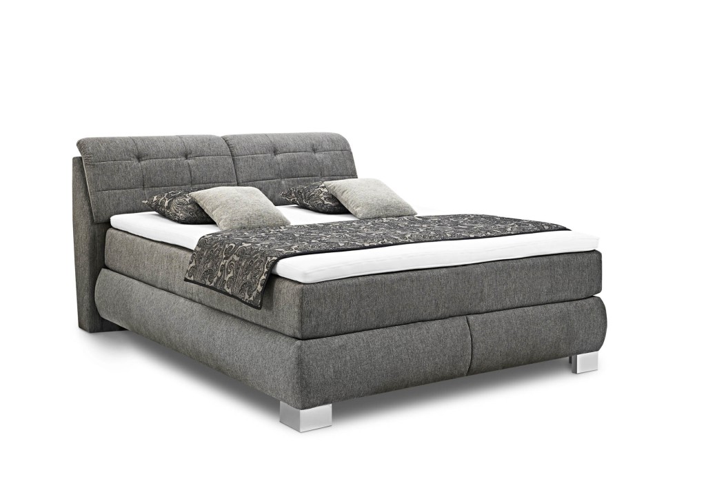 Microchenille, Nutzschicht 100 % Polyester, Grundschicht 100 % Polyester, Farbe anthrazit, Kopfteil Rücken unecht, Metallfüße verchromt, Matratzen Tonnentaschenfederkern H2/H3, Unterbau Taschenfederkern, Optik bombiert, Gel-Topper geteilt, Liegefläche ca. 180x200 cm, BHT ca. 194/112/236 cm