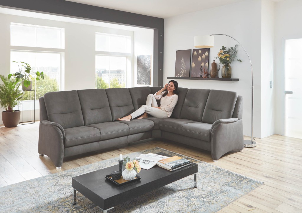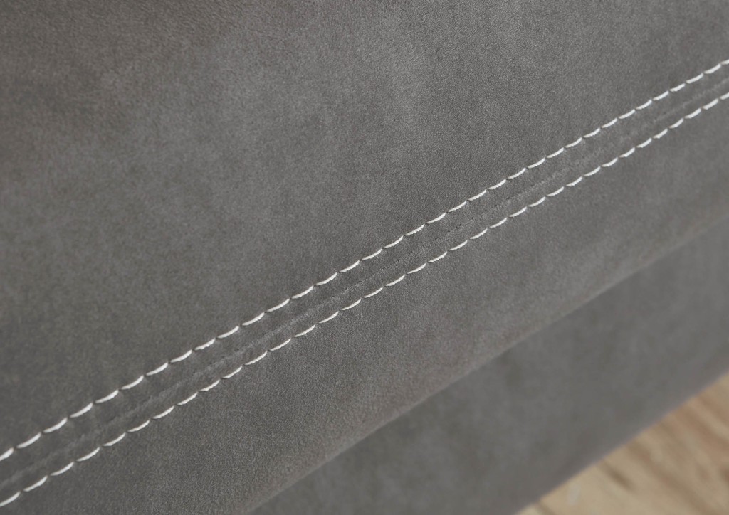 Microfaser, 100% Polyester, Farbe anthrazit, Doppelsteppnaht mit Kontrastfaden beige, Rücken echt, Sitz Boxspring, Metallfuß chromfarbig, Sitzhöhe ca. 49 cm, Sitztiefe ca. 54 cm, bestehend aus: