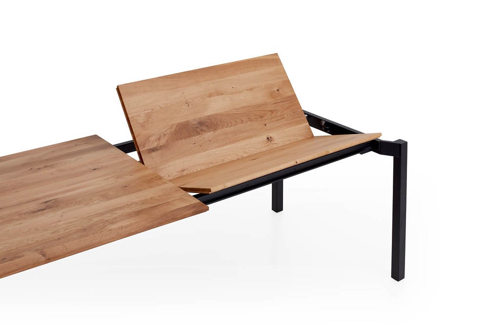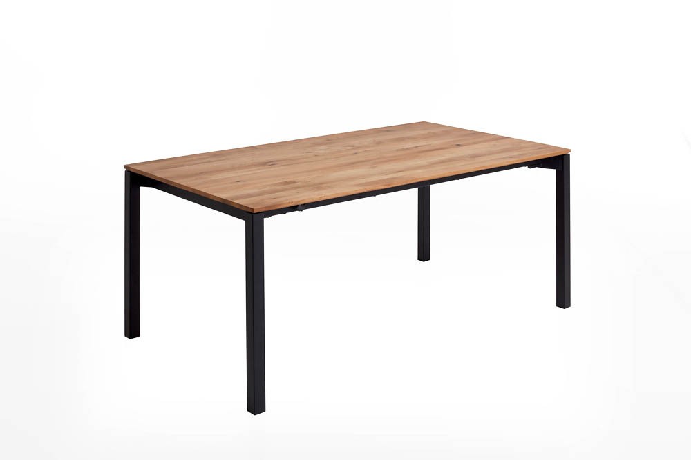 Tischplatte Charakter-Eiche massiv mit Falz-Kante, eine Falteinlage 100 cm, kubisches Gestell Metall schwarz, LBH ca. 180(280)/100/76 cm
