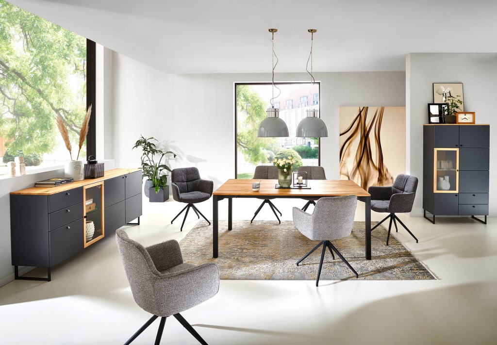 Entdecken Sie den exklusiven Esstisch mit Front Slide – ein Meisterwerk der Handwerkskunst, das Funktionalität und Ästhetik auf höchstem Niveau vereint. Die Tischplatte aus massiver Charakter-Eiche mit edler Falz-Kante verleiht Ihrem Essbereich eine warme, natürliche Eleganz. Dank der innovativen Front Slide-Technologie lässt sich die integrierte Falteinlage mühelos erweitern, wodurch spontanen Gästeempfängen nichts im Wege steht. Das kubische Gestell aus robustem schwarzem Metall setzt einen modernen Kontrast und sorgt für maximale Stabilität. Dieser Esstisch ist nicht nur ein Möbelstück, sondern ein Statement Ihrer Wertschätzung für Qualität und Design. Verleihen Sie Ihrem Zuhause eine unverwechselbare Note und genießen Sie unvergessliche Momente am Esstisch mit Front Slide.